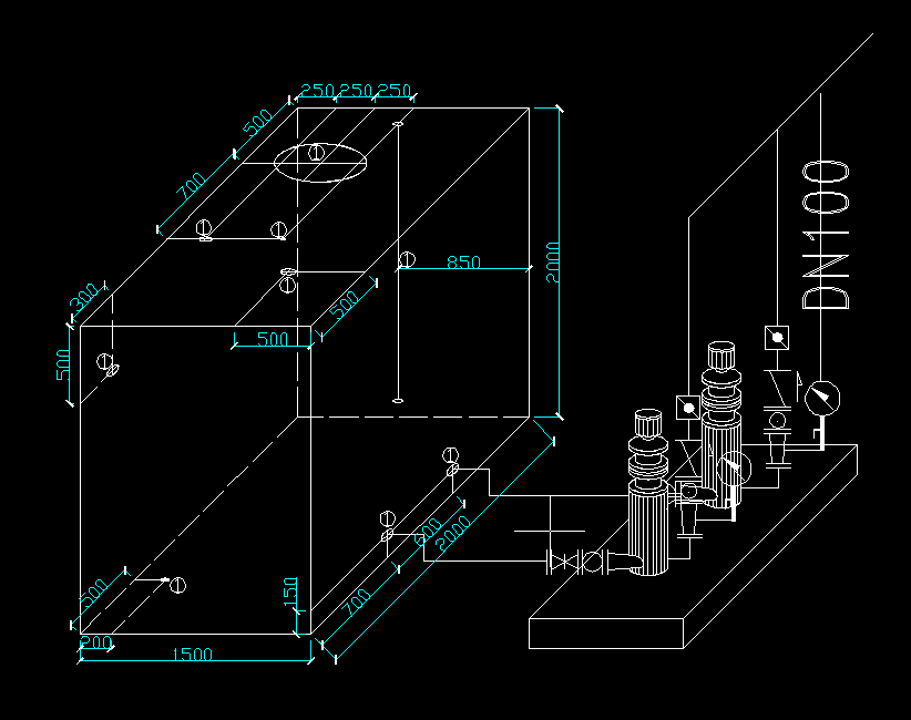 上圖為2000*1500*2000的水箱大樣圖,各處開口位置都已標好,以及外接水泵的詳圖也都已表示清楚,各種水管的接口也已找好,上面那個開口是人孔,詳細的開口位置可由您自行選擇,本圖只給您提供一個樣例。